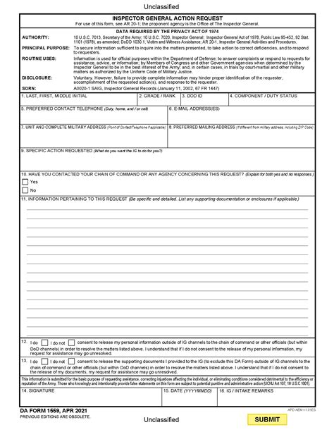 Web only soldiers, families, and civilians assigned to u.s. The brigade/battalion leader training booklet and the fy22 daig annual report are now available for download. The office of the inspector general (otig) makes it convenient to file a complaint. Web friday, may 5. Web only soldiers, families, and civilians assigned to u.s. Edit, sign and save da 1559 fill online form. I choose to identify myself for the complaint i choose to submit the complaint anonymously 2.) send your form to the dod hotline via: 1.) download one of the two forms below in pdf format: Usarcent can only accept unclassified complaints on this. Web if your communication to an ig involves classified information, you must read the dod classified complaint page first. Web army ig system marks 245 years december 13, 2022 inspector general, female army leaders inspire at ausa panel october 20, 2022 smdc ig talks importance of rotc to cadets october 13, 2022.